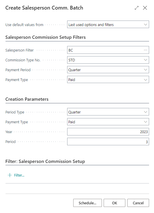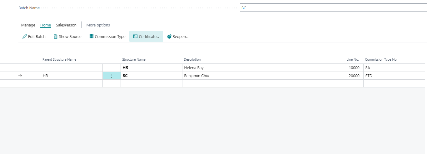 Attraverso i due bottono evidenziati nell’immagine (presa dalla pagina “Salesperson Commision Setup”), è possibile creare ed aprire il batch per le provvigioni maturate.