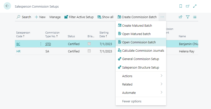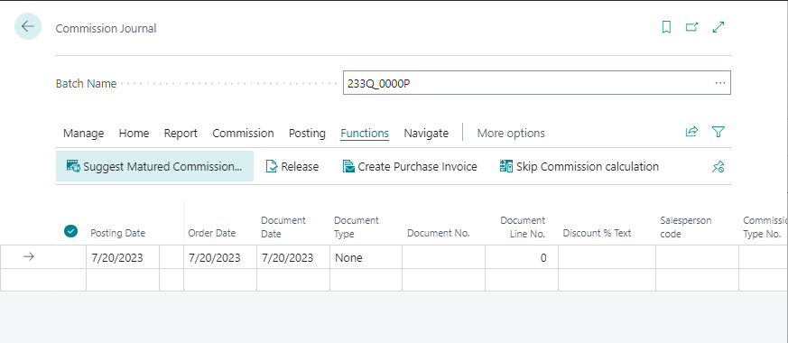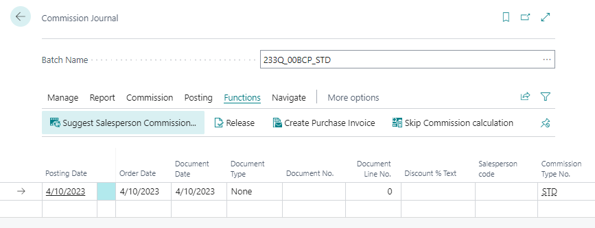 Dalla pagina “Salesperson Commission Setup” si può accedere attraverso i bottoni Create Commission Batch e Open Commission Batch alla pagina “Commission Journal” nella quale si possono gestire le provvigioni dell’agente scelto.
