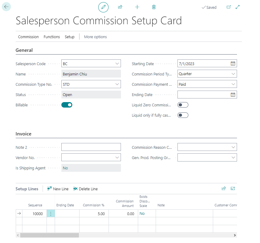 Per impostare il setup dell’agente è necessario solamente accedere alla Salesperson Commission Setup, nella quale è possibile scegliere l’agente, il tipo agente e le relative provvigioni.