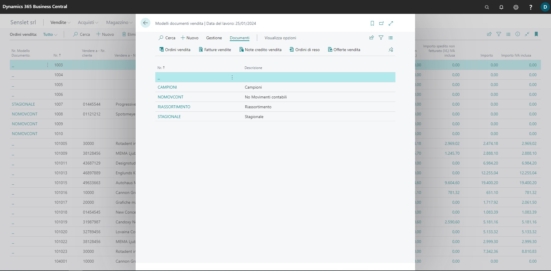In questo esempio, tutti i modelli sono abilitati perciò, ongi volta che verrà aperto un nuovo documento o anche solo per entrare nella lista dei documenti (per es. gli ordini di vendita, o le fatture di acquisto), verrà chiesto di scegliere uno tra i modelli proposti. La pagina che verrà aperta in seguito è la pagina cercata, filtrata per il tipo di documento scelto.