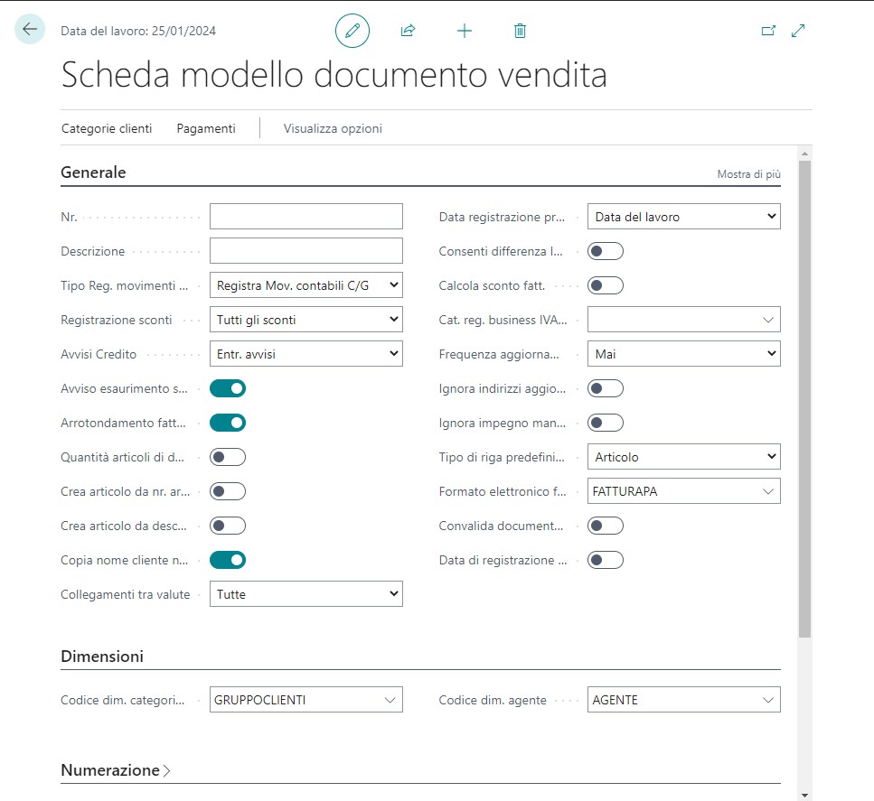 È possibile anche andare a modificare le impostazioni presenti nel setup contabilità clienti (o fornitori), modifiche che manterrà attive solo per il modello di documento in questione. Inoltre, nella sezione ‘Numerazione’ è possibile definire numerazioni specifiche per ogni tipologia di modello.