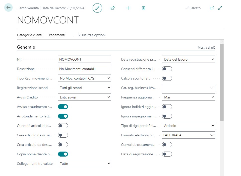 Per esempio nell’immagine successiva, nel modello “NOMOVCONT”, per gli ordini di vendita è stata impostata una numerazione specifica ‘V-NOMOV’.