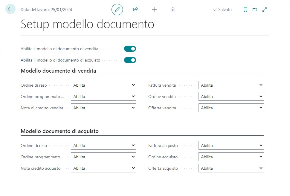 Dopo aver installato l’app, per utilizzare le funzionalità proposte dall’applicazione è necessario abilitarle nella pagina ‘Setup modello documento’. Una volta aperta la pagina e abilitati i flag dei modelli dei documenti di acquisto e di vendita compariranno nella stessa pagina le voci specifiche dei documenti possibili nei quali abilitare o disabilitare le funzionalità.