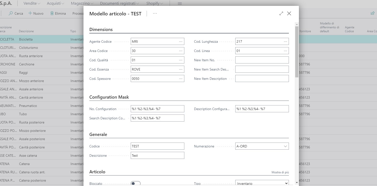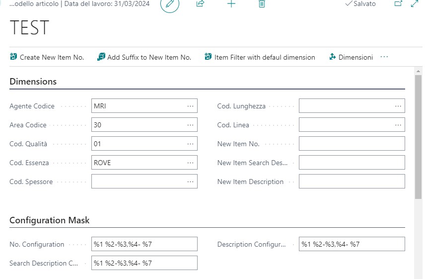 Questi codici sono generati sulla base di una matrice data dai valori delle dimensioni e modificabili nella scheda modello. La descrizione dell’articolo è modificabile anche nell’anagrafica articolo, nella parte “Configuration mask”. Se si vuole cambiare il codice, o se lo si vuole abbreviare, è possibile inserire, utilizzando l’azione “Add Suffix to New Item No.”, un progressivo nel codice articolo. In questo modo sarà preservata l’univocità del codice. L’azione “Item filter with default dimension” dà accesso alla scheda articoli filtrata sui valori impostati nelle dimensioni.