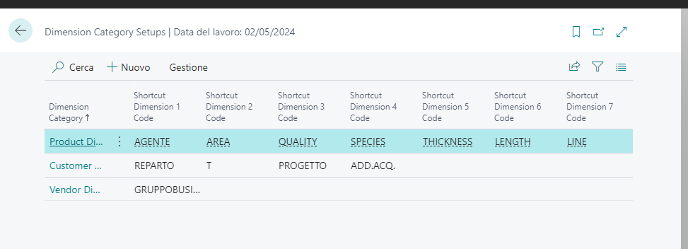 Affinchè si possa usufruire di queste dimensioni è necessario innanzitutto rendere attiva l’applicazione andando nella pagina “Dimension Setup” e portando a true il flag “Configure Templ. Item No.”. Nella pagina sono presenti anche i campi: “Def. Description Language Code” per impostare il linguaggio predefinito, “Def. Country Dimension Code” per le dimensioni di default alla generazione di un nuovo cliente, “Def. Item Dimension Code” se è compilato, va ad inserire nella dimensione “Item” un nuovo valore dimensione con codice, del valore dimensione, il codice dell’articolo e per descrizione, la descrizione dell’articolo. Con “Def. Salesperson Dimension Code” allo stesso modo si andrà a creare un valore nella dimensione “AGENTE” (se impostato) con il codice dell’articolo e la descrizione.